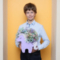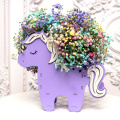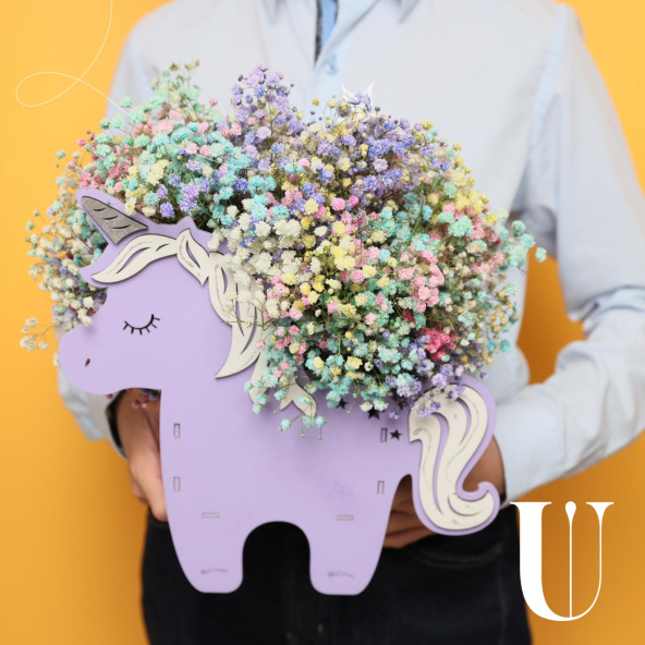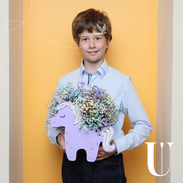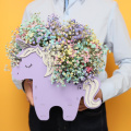 Композиция из крашеной гипсофилы разных цветов в деревянном кашпо в виде единорога