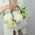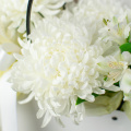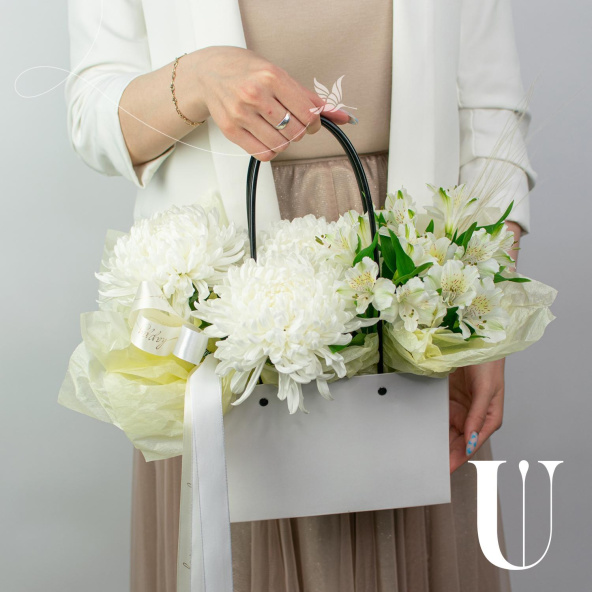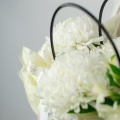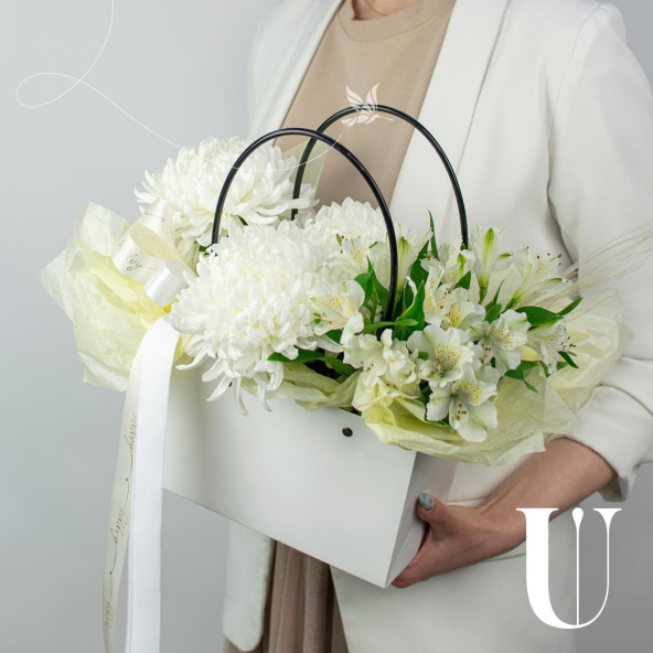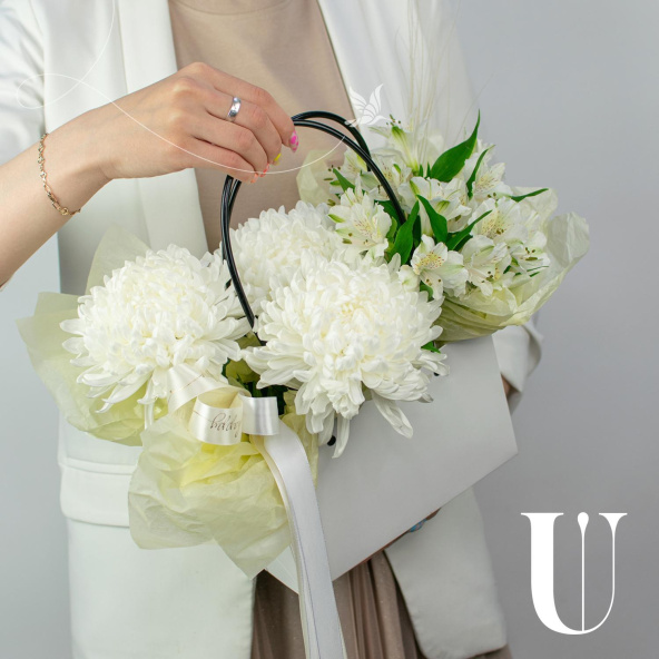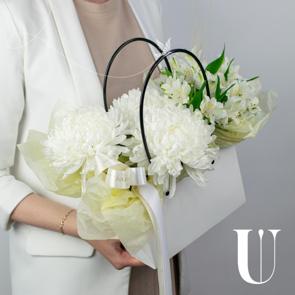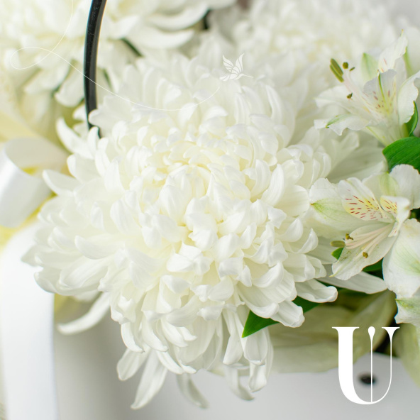 Композиция из хризантемы Магнум, белых диантусов и белой маттиолы в розовой шляпной коробке