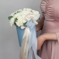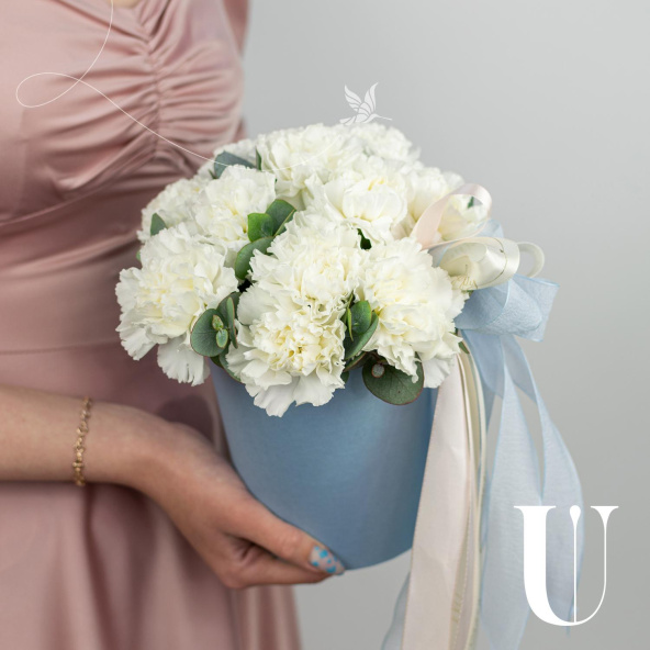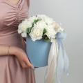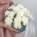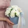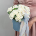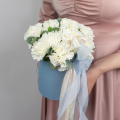 Яркая композиция с пионовидной розой и декоративной тыквой в шляпной коробке