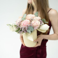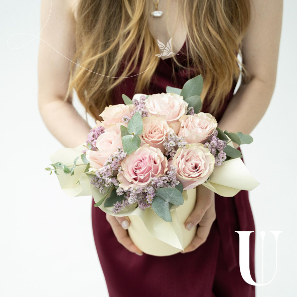 Нежная композиция в светло-розовой шляпной коробке