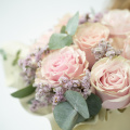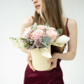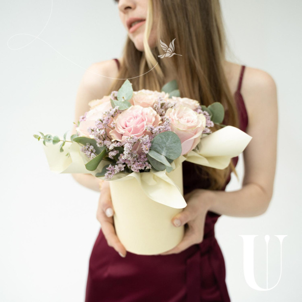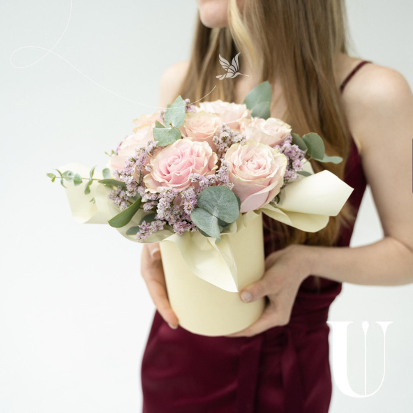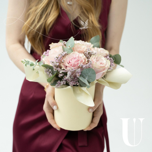 Милая шляпная коробочка с розами, эвкалиптом и лимониумом