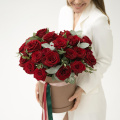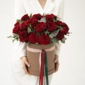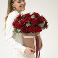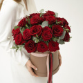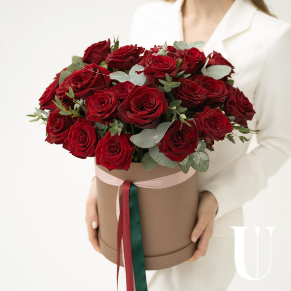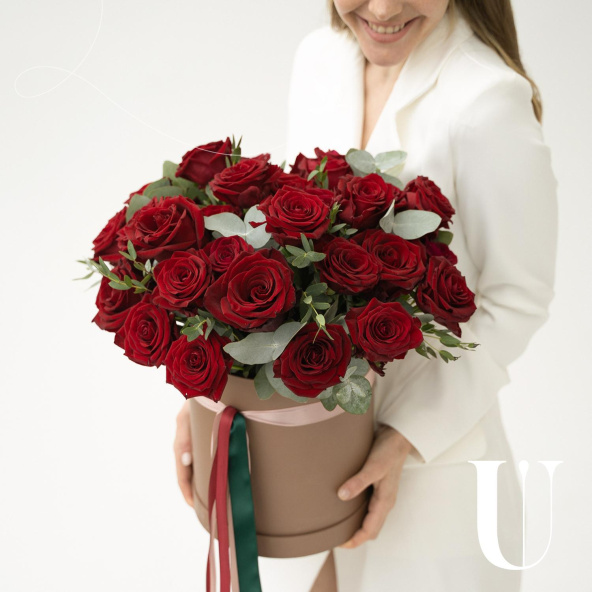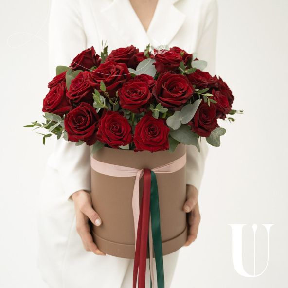 Шляпная коробка с композицией из красных роз и эвкалипта