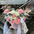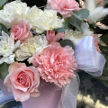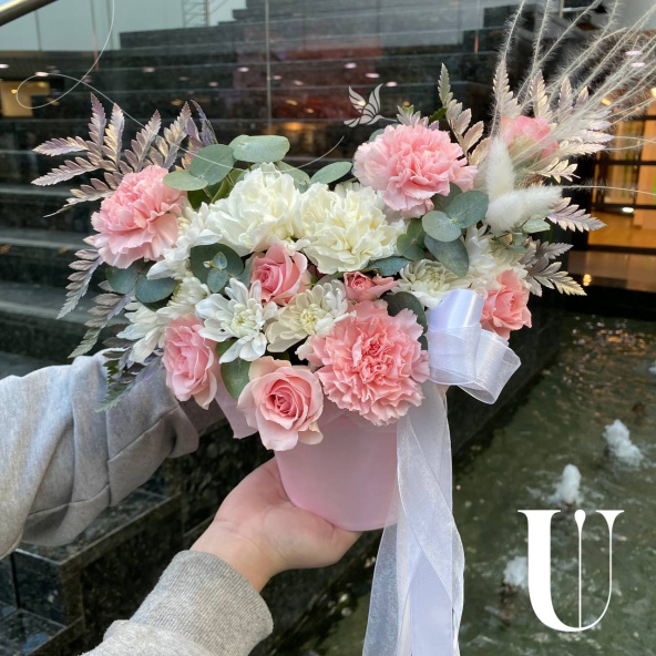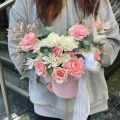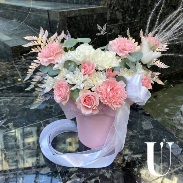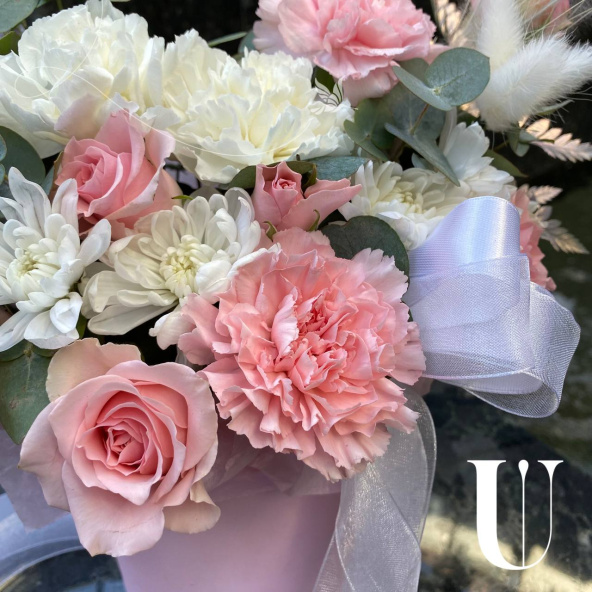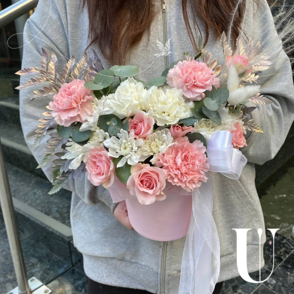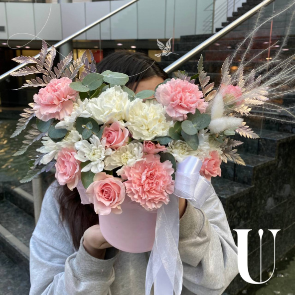 Нежная композиция из роз и гвоздик в шляпной коробке
