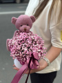 Композиция из хризантемы Магнум, белых диантусов и белой маттиолы в розовой шляпной коробке