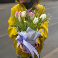Композиция из хризантемы Магнум, белых диантусов и белой маттиолы в розовой шляпной коробке
