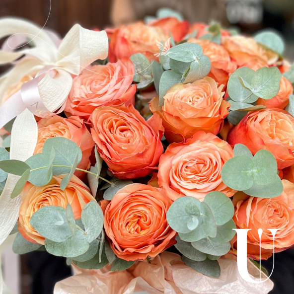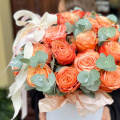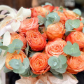 Сочетает в себе роскошную пионовидную персиковую розу и ароматный эвкалипт