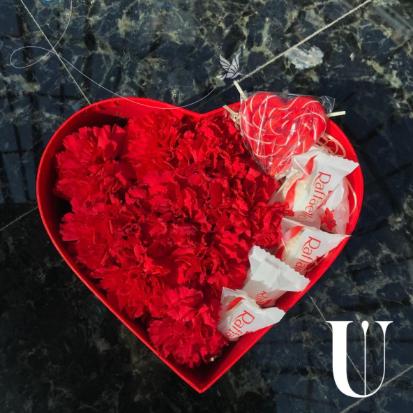 Диантусы, кустовая роза и макаруни в коробке формы сердца