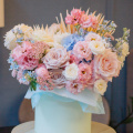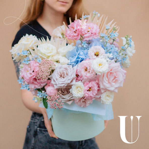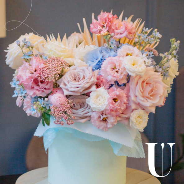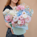 Шляпная коробка в розово-голубой гамме с пионовидными розами и гортензиями