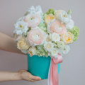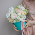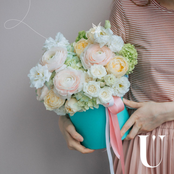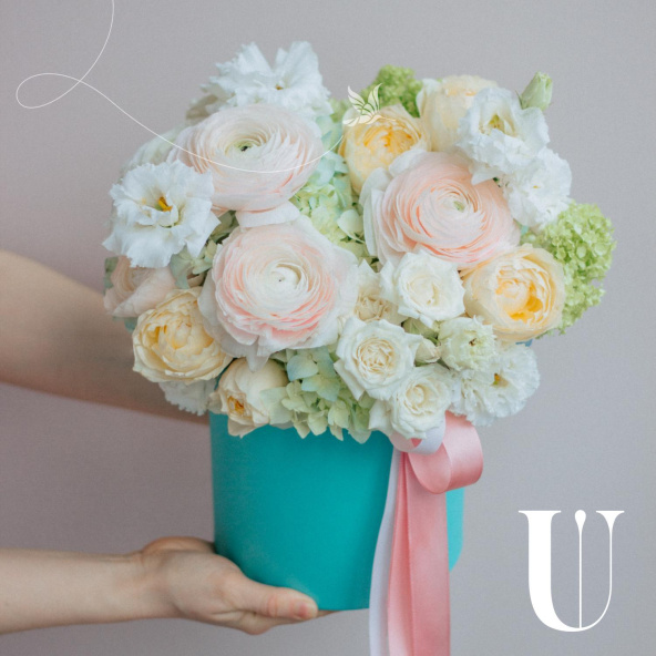 Шляпная коробочка с ранункулюсами, гортензией, пионовидными розами, диантусами и лизиантусом
