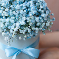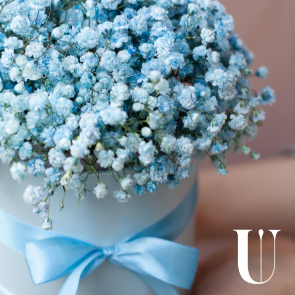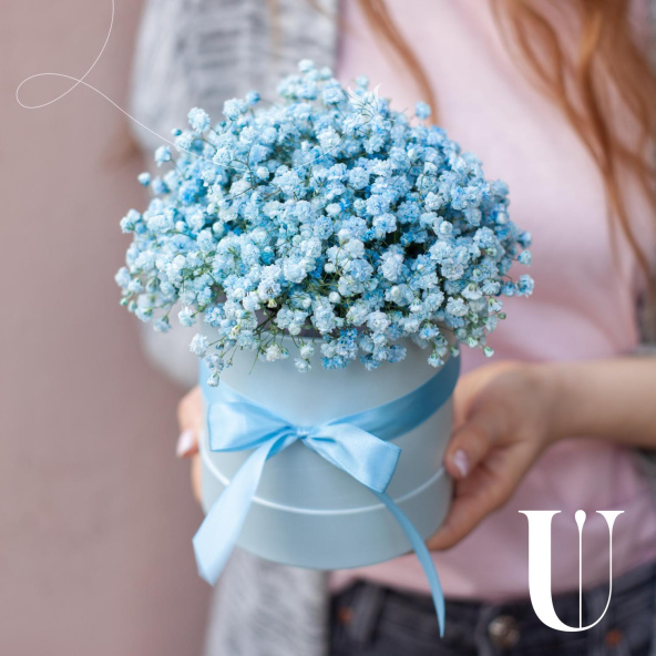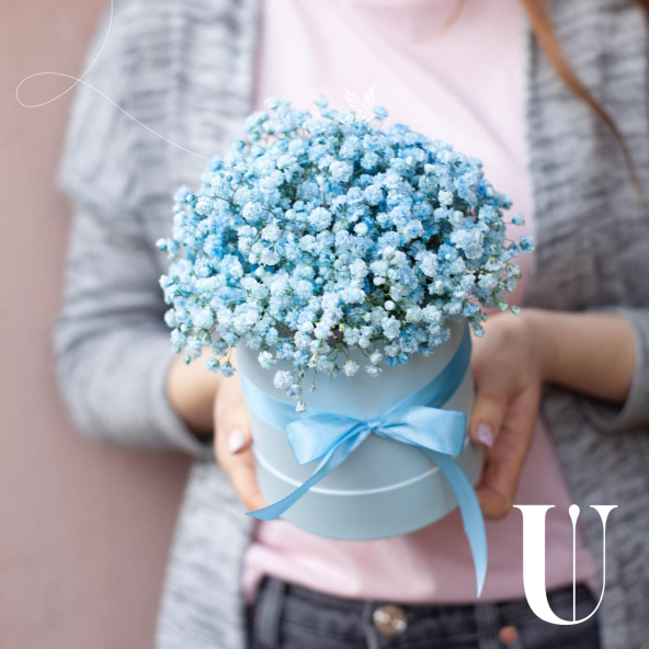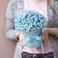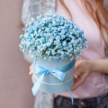 Композиция из 11 белых диантусов в голубой шляпной коробке