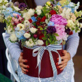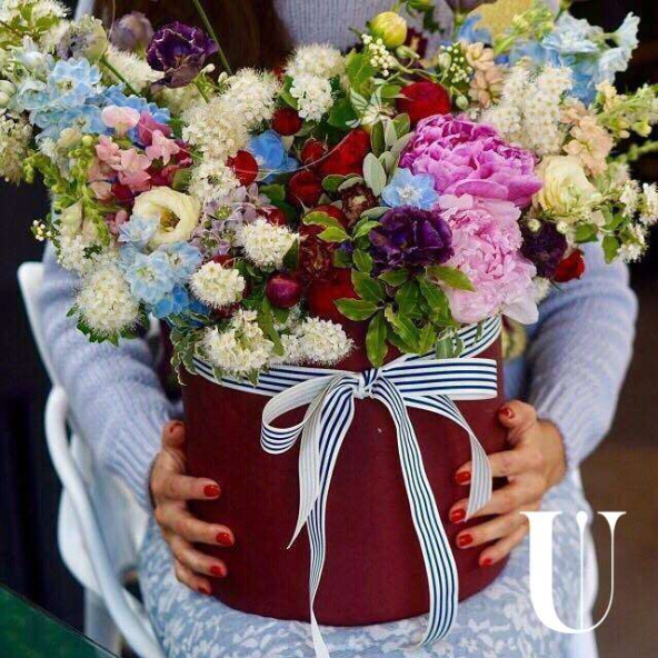 Композиция из роз Кэндллайт и кустовых пионовидных роз Бомбастик в шляпной коробке