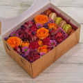 Золотая коробка с яркой композицией в рыжих тонах и 6 пирожными макарун. Коробка закрывается крышкой, доставляется в пакете