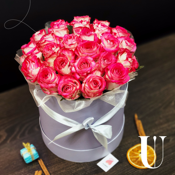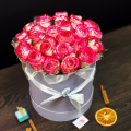 Композиция из 35 роз в шляпной коробке. Используется флористическая губка