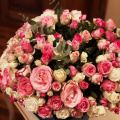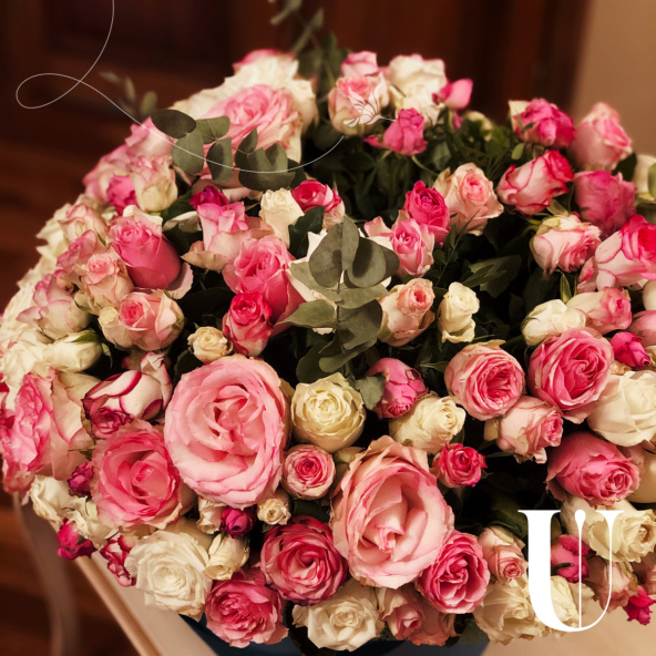Композиция из 150 роз в шляпной коробке. Используется флористическая губка