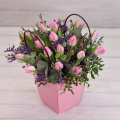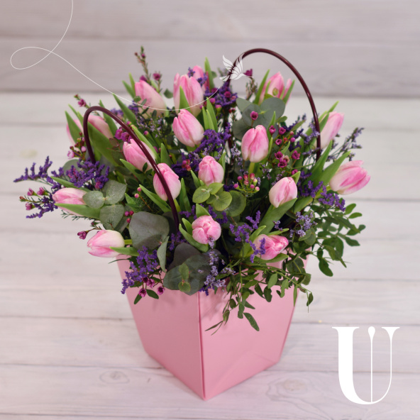 Тюльпаны розовые - 19 шт., эвкалипт, фисташка, воксфлауэр, лимониум