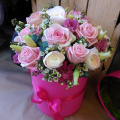 - Шляпная коробка с пионами, розами и лизиантусом