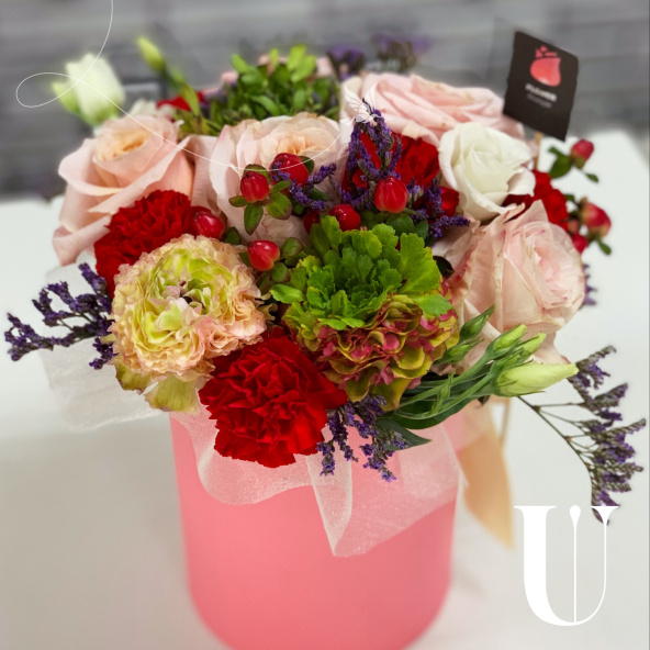 - Авторская композиция в шляпной коробочке с розами нежных цветов ( розовые и белые)