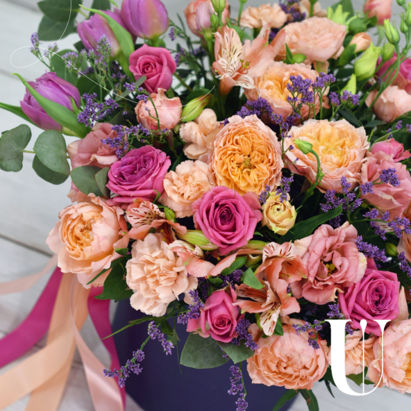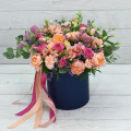 Роскошная композиция в шляпной коробке темно-синего цвета с лентами в тон цветам
