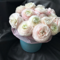 Роскошная композиция в шляпной коробке с 15 ранункулюсами
