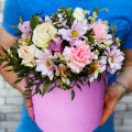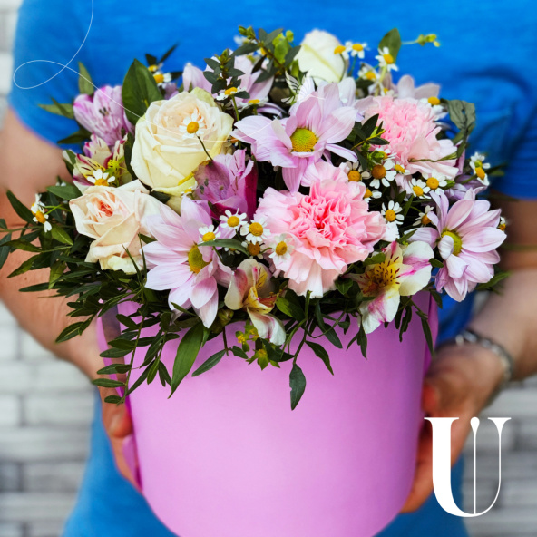 - Композиция в розовой шляпной коробке с розами