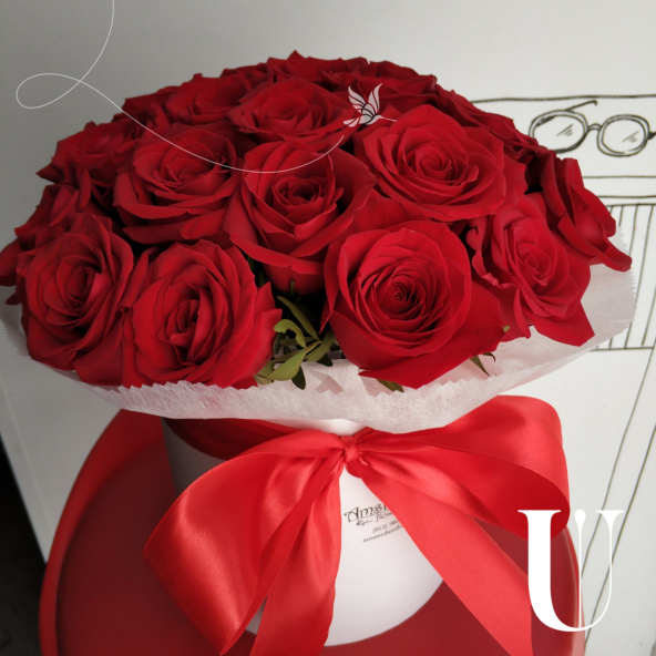 Композиция из кремовых роз и диантусов в белой шляпной коробке