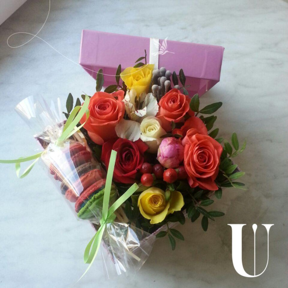 Цветы в коробке "Композиция с 3 макарони"
