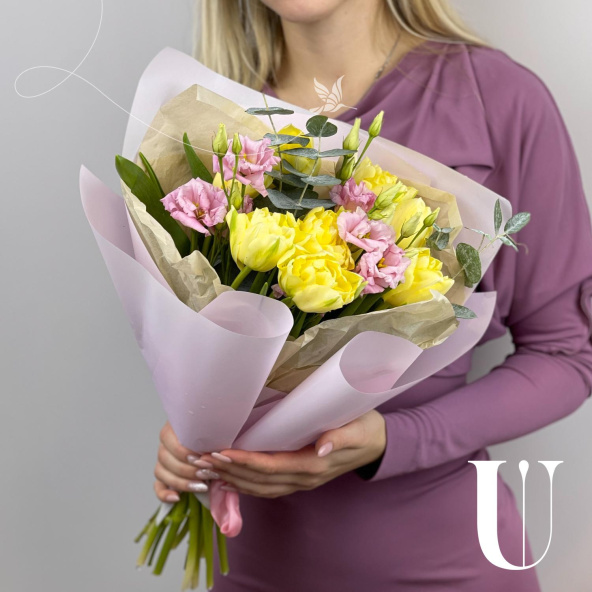 Букет из розовых гортензий и белых тюльпанов в розовой упаковке