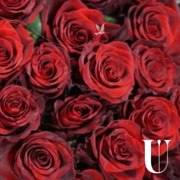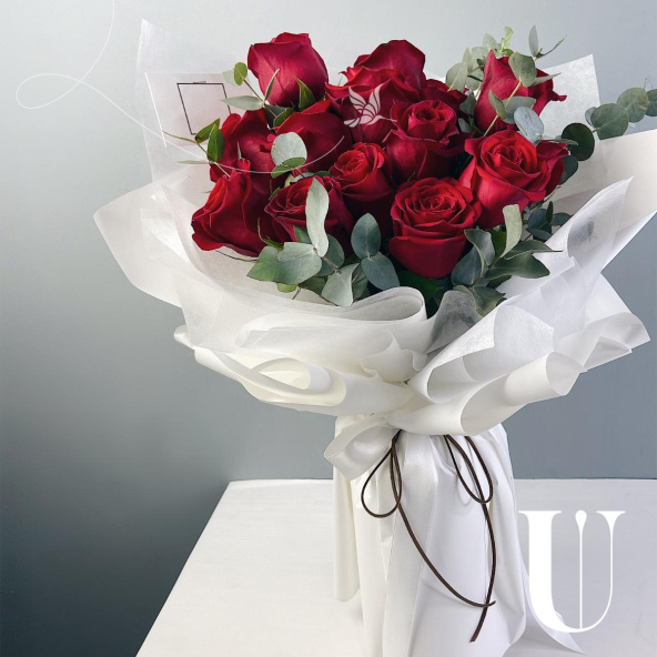 Монобукет из 15 красных роз с Эвкалиптом.