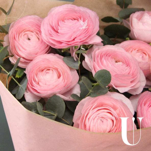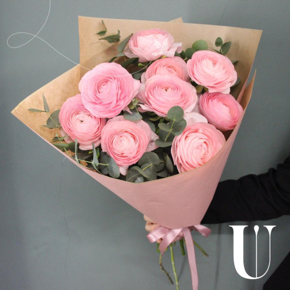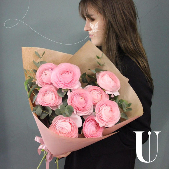 Нежный букет из девяти ранункулюсов с веточками ароматного эвкалипта, в лаконичной упаковке.