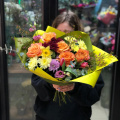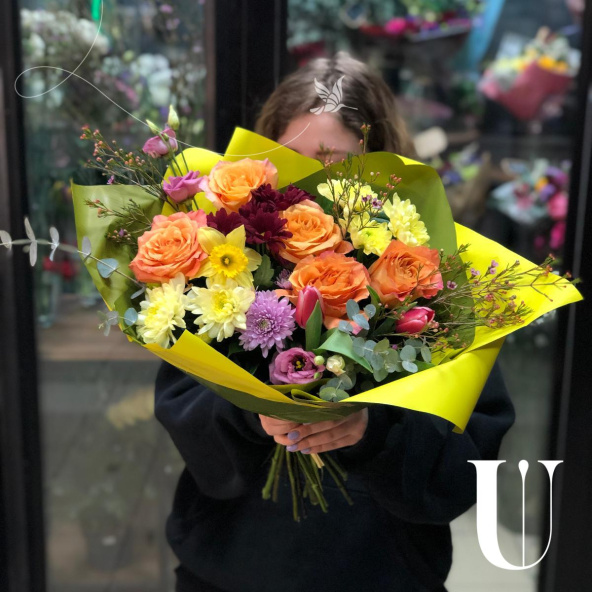 - Состав: роза-5,хризантема кустовая-3,эустома-2,вереск-2,нарцисс-1,эвкалипт-2