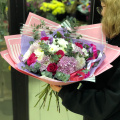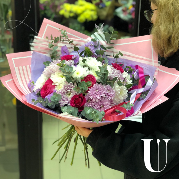 Состав: хризантема кустовая-5,роза эквадор-5,хризантема одноголовая-3,эвкалипт-7,статица-5