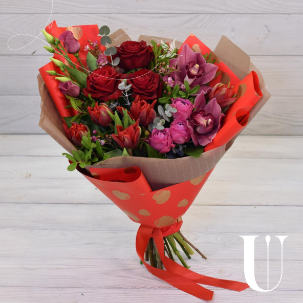 Розы красные - 3 шт., тюльпаны красные - 5 шт., орхидея Cumbidium - 2 шт., роза кустовая Misty Bables - 1 шт., лизиантус - 1 шт., воксфлауэр, фисташка, эвкалипт