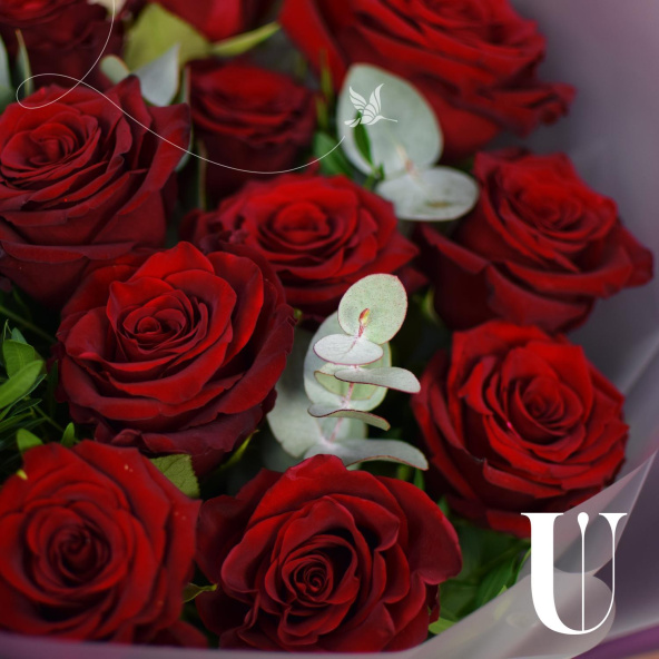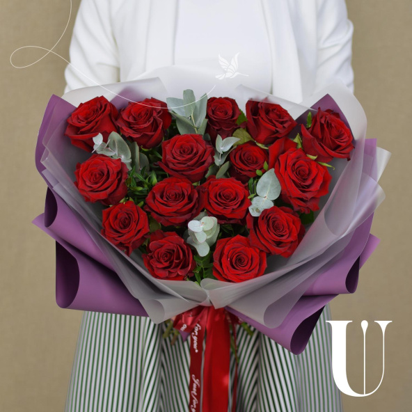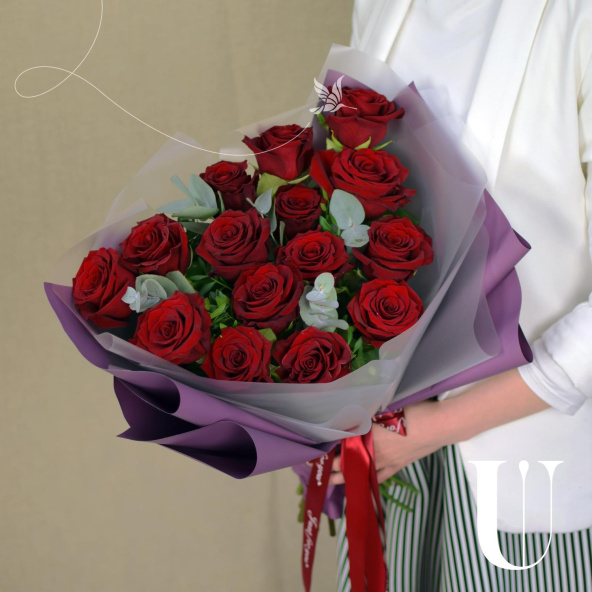 Классическое сочетание 15 роз насыщенного красного цвета и ароматного эвкалипта