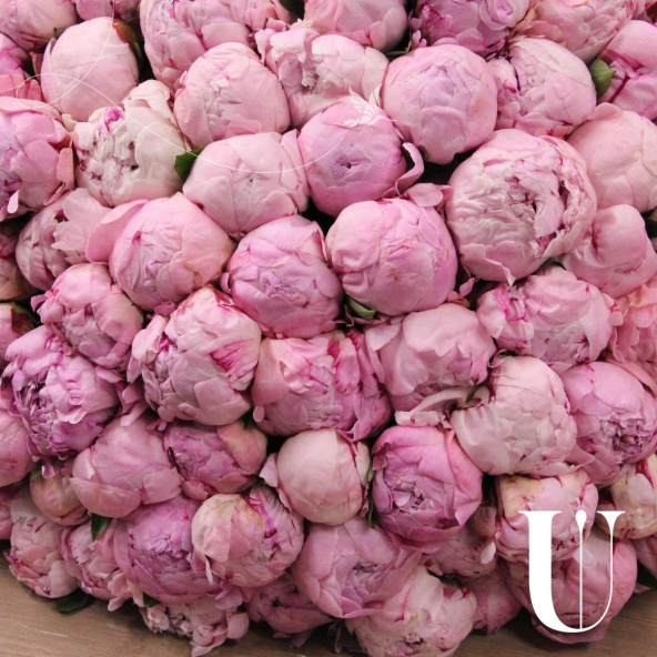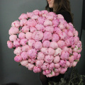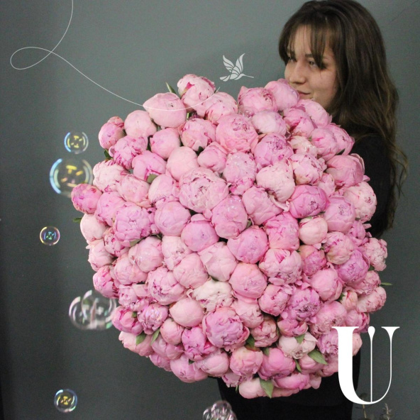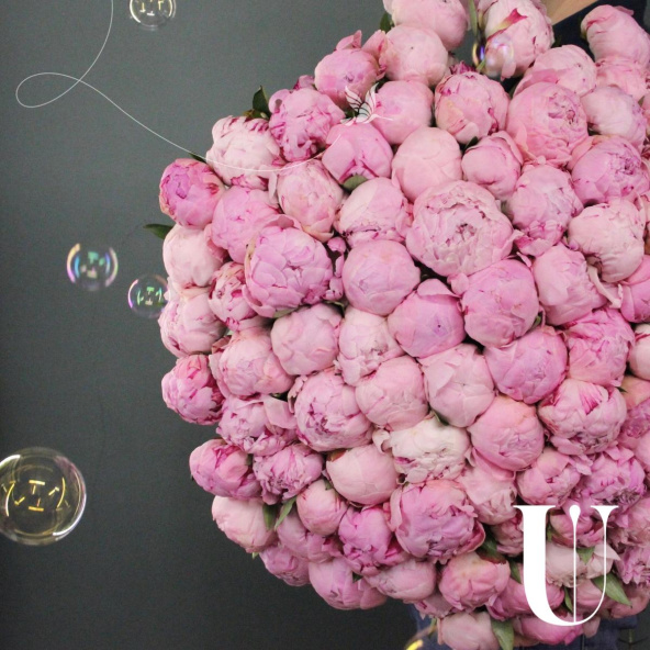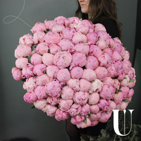 Роскошная охапка из 101 пиона, связанного атласными лентами.