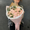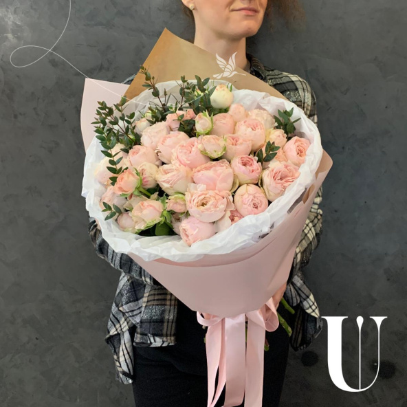 Монобукет из розовых кустовых пионовидных роз в дизайнерской упаковке