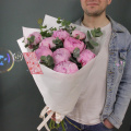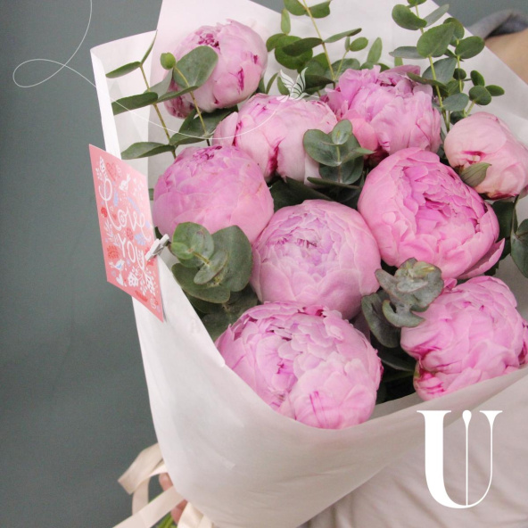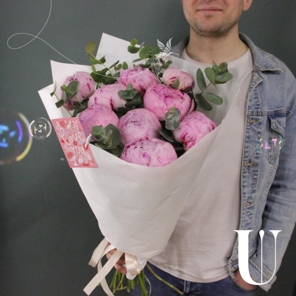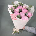 Букет из девяти розовых пиона и веточек эвкалипта, в лаконичной упаковке