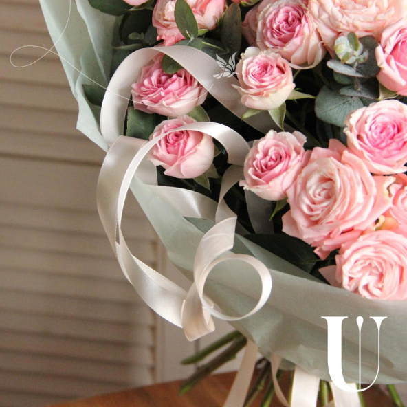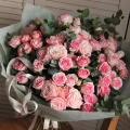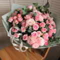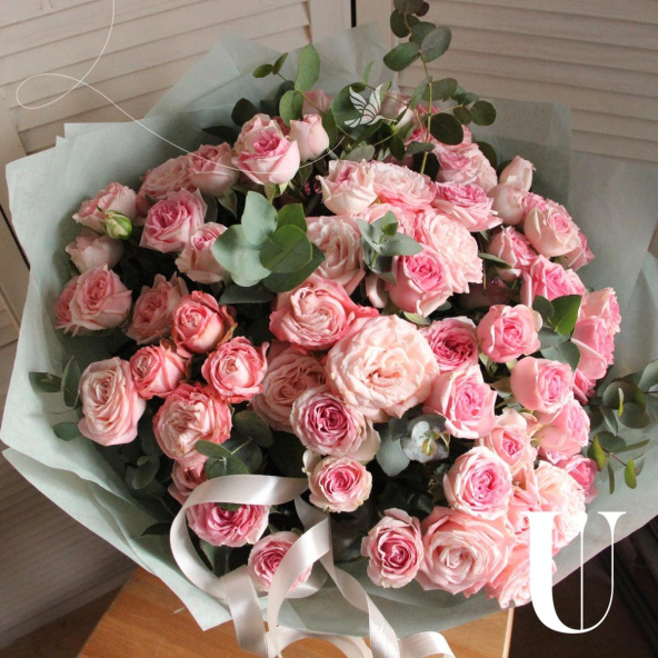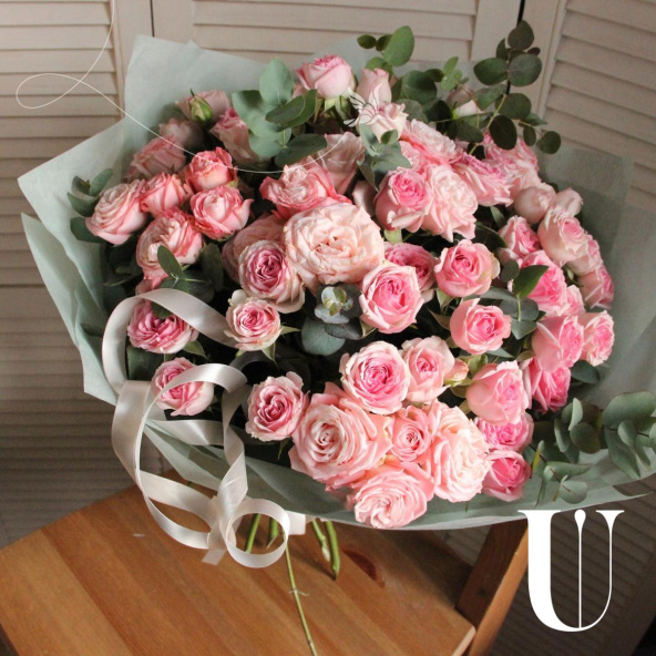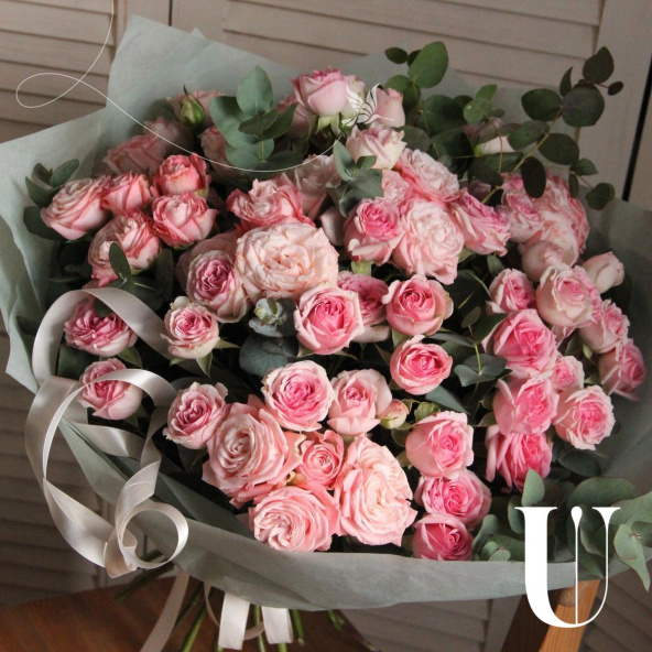 Букет из кустовых пионовидных роз с веточками ароматного эвкалипта в лаконичной упаковке