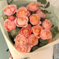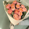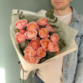 Монобукет из пионовидных роз Кахала и лимониума в нежной упаковке