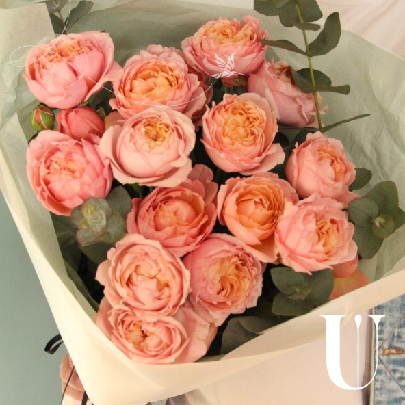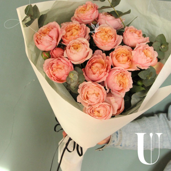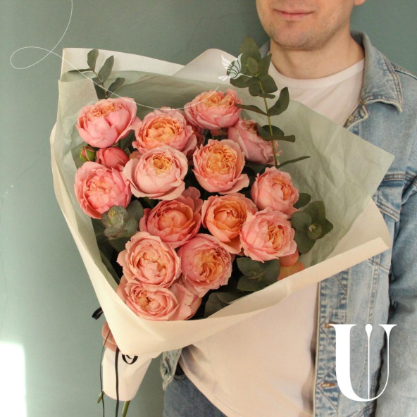 Букет из пяти кустовых пионовидных роз и веточек ароматного эвкалипта, в лаконичной упаковке.