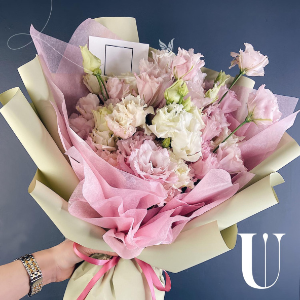 Монобукет из розовых кустовых пионовидных роз в дизайнерской упаковке