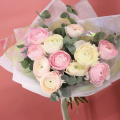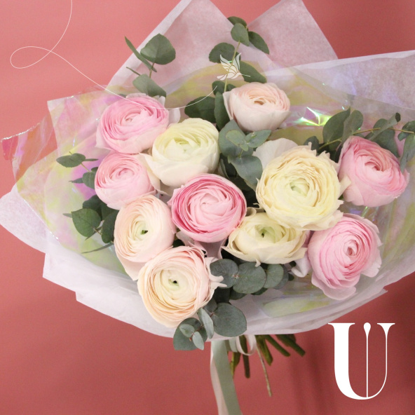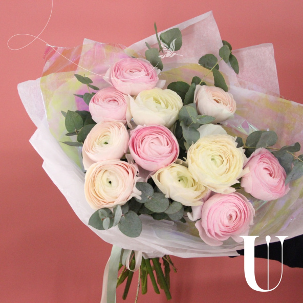 Букет из 11 нежных ранункулюсов и веточек ароматного эвкалипта, в стильной упаковке.