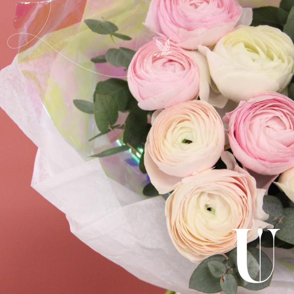 Букет из 11 нежных ранункулюсов и веточек ароматного эвкалипта