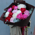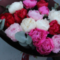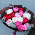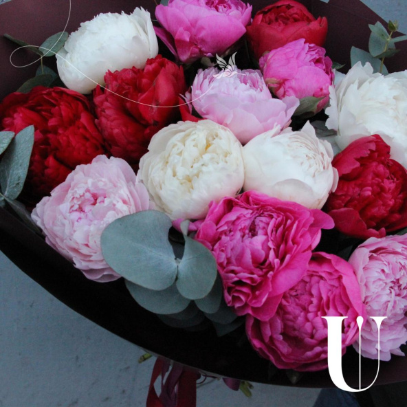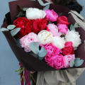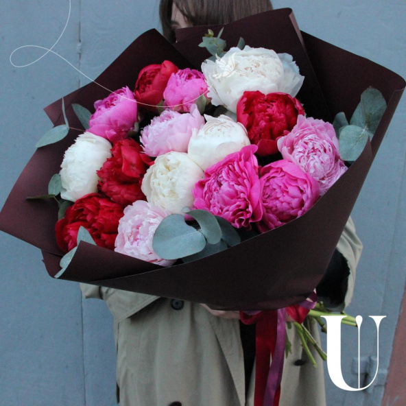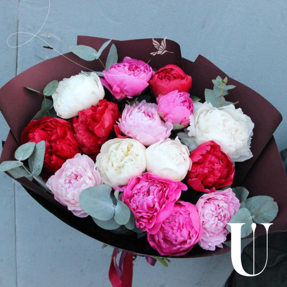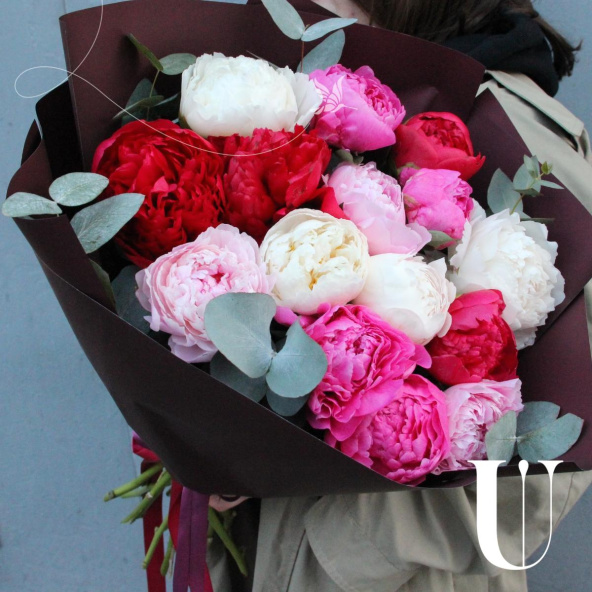 Букет из микса 15 пионов и веточек ароматного эвкалипта в лаконичной упаковке