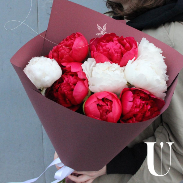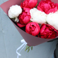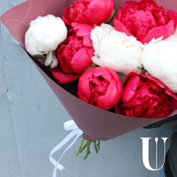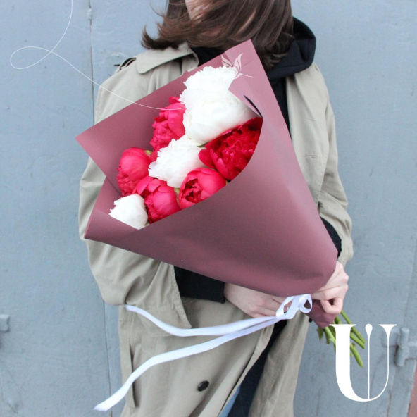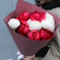 Букет из пионовидных роз Мандарнин Экспрешн и кустовых роз Джульетта в упаковке