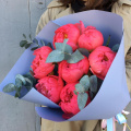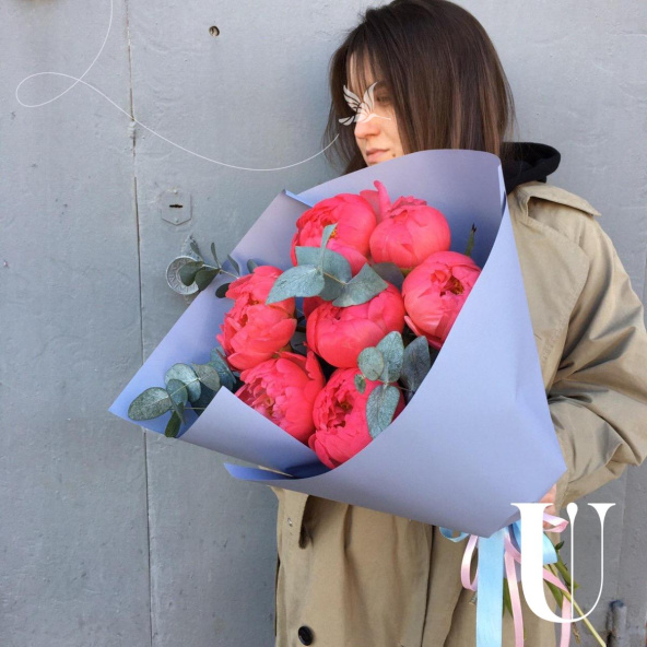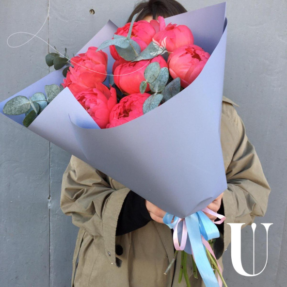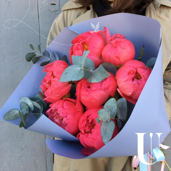 Яркий букет из 7 коралловых пионов с веточками ароматного эвкалипта в лаконичной упаковке