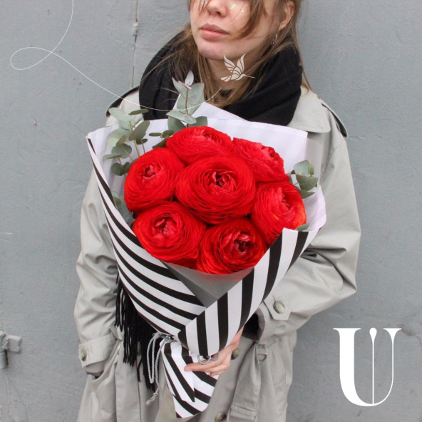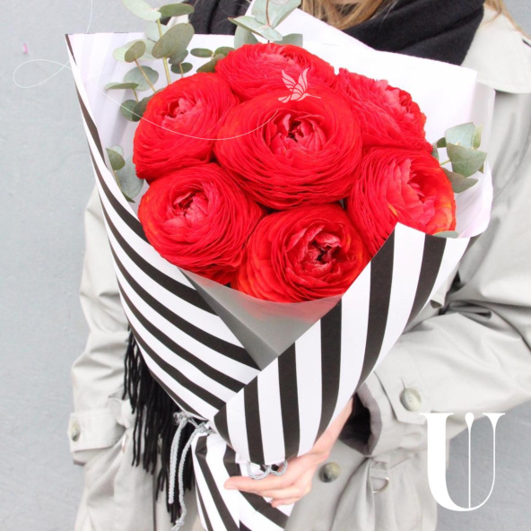 Стильный букет из несравненных алых ранункулюсов, семь штук и ароматного эвкалипта