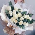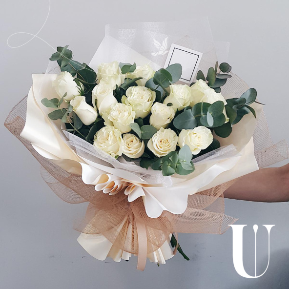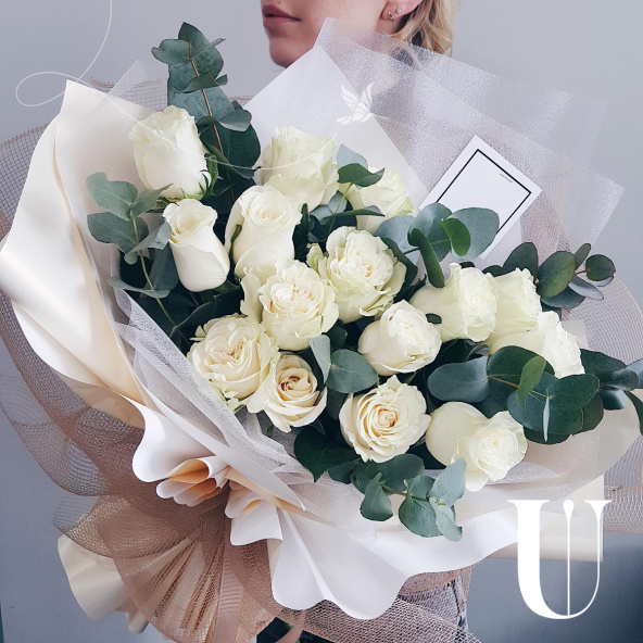 Стильный белый букет из роз Вайт Охара в дизайнерской упаковке
