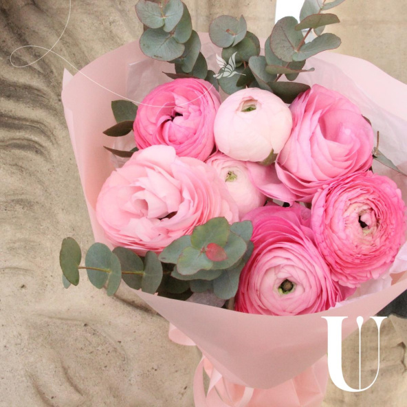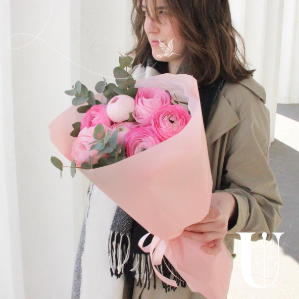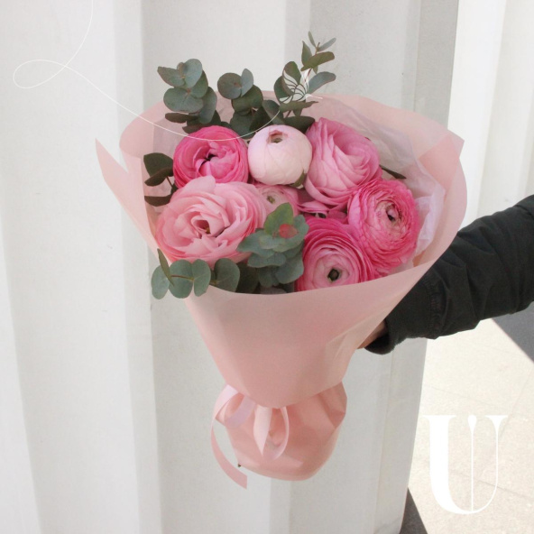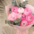 Букет с семью розовыми ранункулюсами и веточками ароматного эвкалипта