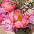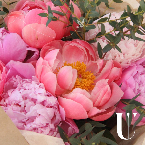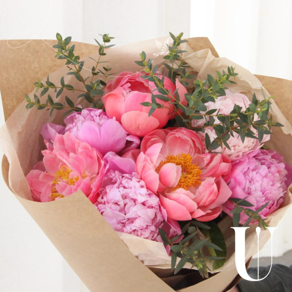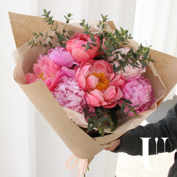 Букет из 7 пионов и веточек ароматного эвкалипта