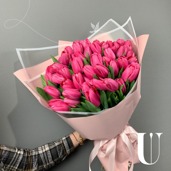 Стильный монобукет из 25 пионовидных роз Кахала в упаковке